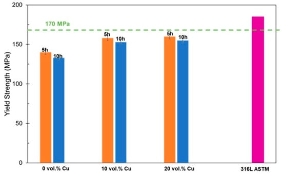 The yield strength for the material was estimated using an ultrasonic method and compared to a sample of pure 316L. Results are shown in Figure 8. They show a similar trend with the highest yield strengths found for the largest Cu contents. They also show a consistent decrease in yield strengths for the longer sintering dwell times. These are closer, but still fall short of the minimum 170 MPa requirement for 316L.
