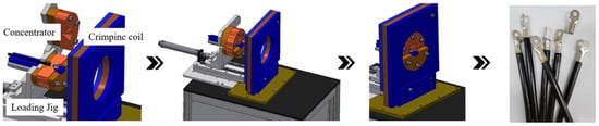 Figure 3 shows crimping of a terminal using the MPC process. Because the MPC process uses high electrical energy, it requires a remote controller and loading/unloading jig to reduce tack time and to ensure worker safety during crimping. The MPC process was initiated by inputting the terminal into a concentrator on a loading/unloading jig. Then, the concentrator traveled toward the one-turn crimping coil. It was pushed by the hydraulic compressor using an electric motor. After set-up, the electrical energy was charged to the pulse power source and then discharged by the controller to the crimping coil within a microsecond; due to this magnetic force, the terminal collided at high velocity with copper wire strands.