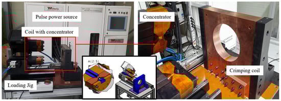 The MPC process is a high-velocity crimping process that uses magnetic force; thus, the MPC system consists of a pulse power source and a working coil with a concentrator and a loading jig, as shown in Figure 2. The pulse power source is instantaneously discharged to generate a primary current with high frequency in the working coil, as shown by I1 in Figure 2. The pulse power source is typically rated according to the energy storage capacity and stored charge energy, as follows []: