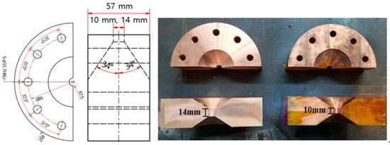 The MPC system manufactured by WELMATE Co., Ltd. of Gimpo, Korea is shown in Figure 4. The pulse power source consisted of 10 capacitors connected in parallel. The capacitors were discharged to a coil by a triggered switch unit. The total capacitance was 613 μF and the charge voltage was less than or equal to 14 kV, so the maximum charge energy was 60 kJ. In particular, two types of concentrators were designed and manufactured using beryllium copper, as shown in Figure 5.