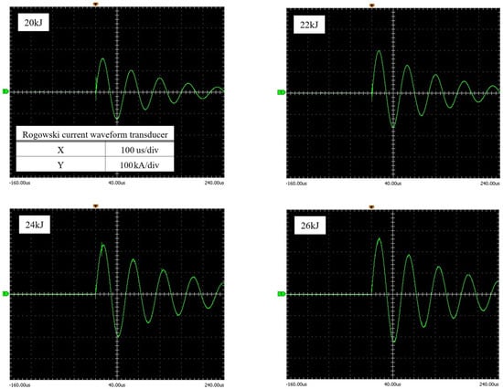 Electromagnetic–mechanical simulation is indispensable when analyzing the MPC process because it makes it possible to predict the shapes of crimped terminals by accurately identifying the magnetic force and how its distribution acts on the terminal within tens of microseconds; these values were difficult to determine in our experiment. To develop the electromagnetic-mechanical FE-model, the commercially available finite element software ANSYS/LS-DYNA (https://www.ansys.com/) was used []. First, an electromagnetic FE-model was established to calculate the electromagnetic force; then, a mechanical model was established to calculate the high-velocity deformation of the terminal. The crimping coil as a rigid body and the terminal as a deformable material were modeled with R3D4 and C3D8R for the FE-model. The general explicit contact algorithm was used for the terminal and wire bundle; thus, the software automatically defined the contact in the model. The Maxwell equations were solved using FEM for solid conductors and the boundary element method (BEM) for the surrounding air. The crimping coil movement was constrained in all directions, including translation and rotation. Figure 7 shows waveforms measured during crimping under various conditions. When discharge from the pulse power source had values of 20 kJ, 22 kJ, 24 kJ and 26 kJ, values of peak current of 160 kA, 200 kA, 230 kA and 268 kA were measured. For the simulation, these waveforms were input to the crimping coil as a sine wave function. However, during the MPC process, the peak current is responsible for considerable deformation, and thus up to 15 was input for the FE-model.