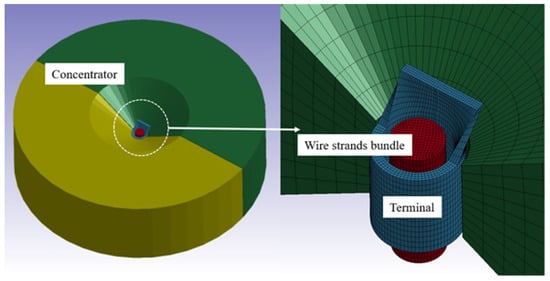 Figure 8 shows the FE-model developed to analyze the distribution of magnetic force. This FE-model consisted of concentrators, which had lengths of 10 mm and 14 mm as shown in Figure 9, and terminal and wire strands, which were simplified into a bundle. The MPC process used high-strain-rate deformation processes, so it was necessary to input the Johnson–Cook material constant parameter values as material properties [,,]. Therefore, the Johnson–Cook constitutive model was used to model the behavior of the deforming terminals. The J-C equation, a combination of plastic strain and plastic strain rate, is shown in Equation (3):