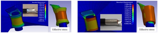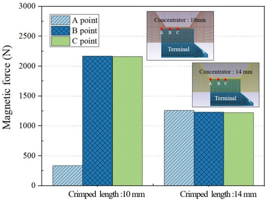 The numerical analysis was divided into two different sections. Electromagnetic analysis was used to calculate the distribution of magnetic force, which was then applied to the mechanical analysis. Figure 9 shows the results for terminals crimped by MPC with two types of concentrators. The results for the crimped terminals show good agreement with the experimental results. Therefore, the developed FE-model was employed to analyze the distribution of magnetic force during the MPC process with various values of crimping length and charge energy.