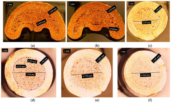 To characterize the E-SPR joints according to the rivet type, experiments were conducted by applying compressor crimping, because the conventional process results in a letter “B”-shaped crimping part. In contrast, a radial crimping part can be achieved using the MPC process. Images of cross sections are shown in Figure 10. The density of wire of the terminal formed by MPC is higher than that formed by the compressor; thus, many voids between wires and between wires and terminals can be observed in Cases A and B. One void was over 0.56 mm in size in Case B, as shown Figure 10b. It was found that, compared to those crimped by a compressor, terminals crimped by MPC show more uniform radial compression deformation and a minimum number of voids between wire strands and terminals. Figure 10c,f show cross-sections of parts formed by the MPC process. When 20 kJ charge energy was applied to the process, crimping parts were separated into wires and terminals during cutting. This shows that 20 kJ is not a sufficient energy level for crimping.