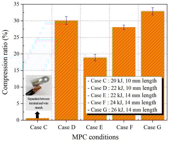 To analyze the effects of crimping length and charge energy in the MPC process, compression ratios were measured under various conditions, as shown in Figure 11. The maximum compression ratios for the crimping lengths of 10 mm and 14 mm were 30.3% and 18.9% under 22 kJ, respectively. With the increases in crimping length, the wire density in terminals decreased, and many voids between wires and between terminals and wires were observed. This means that increasing the crimping length led to a decrease in the compression ratio. The minimum compression ratio under 14 mm crimping length was 18.9%, for Case E at 22 kJ; the maximum compression ratio was 32.3% for Case G at 26 kJ. In Case E, due to the lower compaction, a gap of approximately 0.2 mm was measured between the terminal and the wire strands, as shown in Figure 10d. Very few internal gaps were observed in Case G, as shown in Figure 10f. By increasing the charge energy at the same crimping length, compression ratio was increased. Additionally, reductions in individual wires were observed in Case D, Case F, and Case G. The maximum diameter of an individual wire was 0.22 mm before crimping and 0.20 mm after crimping. The magnetic force increased with increases in charge energy. To analyze the magnetic force of the MPC process, the verified electromagnetic FE-model was employed.
