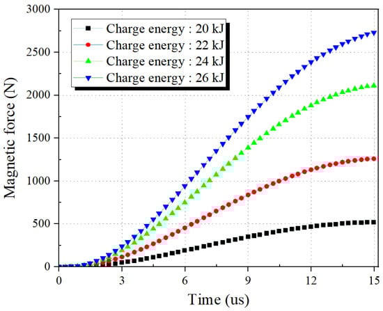 Magnetic force values with various energy charges (concentrator length 14 mm).