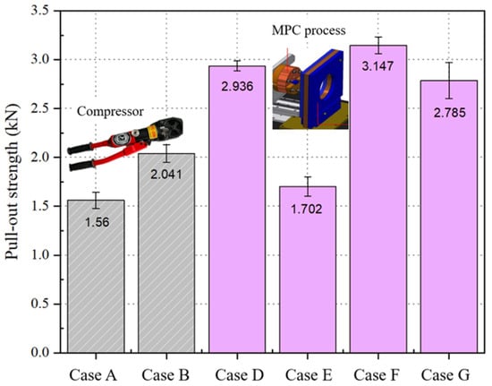During the operation of a system connected with a crimped terminal, occurrence of separate terminals and wires can cause many kinds of damage, such as fire and system breakdown. Therefore, pullout strength is a very important factor required to maintain terminal function during energy transmission. Figure 14 shows the strength of the pullout tests for the various crimping conditions. The pullout strengths induced by the compressor for Case A and Case B were measured at 1.560 kN and 2.041 kN under different crimping lengths. Because the crimping length increased from 10 mm to 14 mm in Case B, the pullout strength increased slightly. During the MPC process, the pullout strengths of Case D and Case E were measured at 2.936 kN and 1.702 kN, respectively. When the crimping length increased from 10 mm to 14 mm with 22 kJ charge energy, the pullout strength decreased by about half. Because the magnetic force for crimping decreased according to the increasing crimping length, as seen in Section 5.1, the pullout strength decreased sharply in Case E. To analyze the effect of charge energy, the pullout strength values of Cases E, F, and G were compared. The pullout strengths of Case E and Case F were 1.702 kN and 3.147 kN; it was found that increasing the charge energy led to increased pullout strength due to the increased magnetic force, as shown in Figure 14. The pullout strength depends on the compression ratio of the plasticized crimp between the terminal and the wire strands []. The compression ratio increases with deformation, which increases with charge energy. Unexpectedly, the pullout strength decreased in Case F, which was manufactured to have the highest charge energy. Because a portion of copper wire strands adjacent to the edge of the terminal were squashed and compressed during crimping by the high magnetic force, this sample broke easily during the pullout strength test. From these results, it can be confirmed that, although compared to the compressor process the MPC process is effective in terms of pullout strength, too-high charge energy can lead to decreased pullout strength. Therefore, proper charge energy selection is important to achieve high-quality MPC crimped parts.