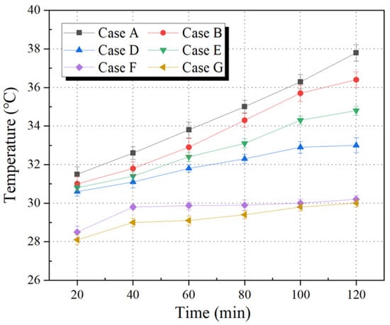 Figure 15 shows measured temperatures of crimped terminals under various conditions over a period of 120 min. After 40 min, the temperature of the terminal crimped using a compressor was measured and found to be approximately 32.5 °C. The MPC terminal had a temperature of 31.1 °C. As time passed, the temperature difference increased and, after 120 min, the maximum temperature of the terminals crimped using the compressor and MPC were 37.8 °C for Case A and 34.3 °C for Case E.