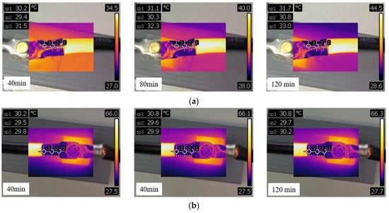 Effects of charge energy and crimping length on temperature rise of crimped terminal. (a) Charge energy 22 kJ, crimping length 10 mm; (b) charge energy 26 kJ, crimping length 14 mm.