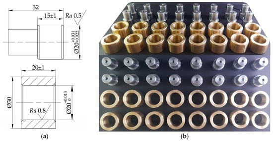 This study discusses cylinder-shaped interference fits due to their widespread application. Following the archetypal research [,,,,], this study concentrates on the fit’s nominal diameter df of 20 mm, with strict machining tolerances and other interference-fit factors (Figure 1). In Figure 1b, the upper figure is the front view and the lower figure is the top view of the selected specimens.
