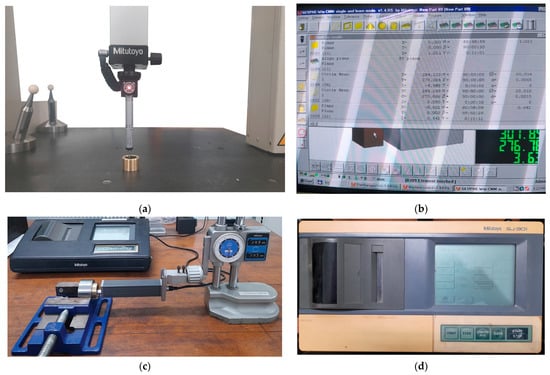 The measuring processes started with a diameter evaluation on the Mitutoyo Beyond Apex 504 (Mitutoyo Corporation, Sakado, Japan) (Figure 3a,b) and were carried out at six points on three equally spaced cross-sections. The surface roughness examinations were performed on six ruling lines and were repeated twice on each line to make sure the fit’s length was all covered. Specifically, the arithmetic average roughness (Ra) levels were considered under DIN EN ISO 4288 [] with Gaussian filter and a cut-off wavelength λc = 0.8 mm. The roughness evaluation was made with the Mitutoyo SJ-301 surface profiler (Mitutoyo Corporation, Sakado, Japan) (Figure 3c,d).