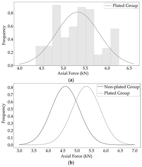 Normal probability density curves for the mean axial force results in slip analysis of plated group (a) and comparison between non-plated and plated group (b).
