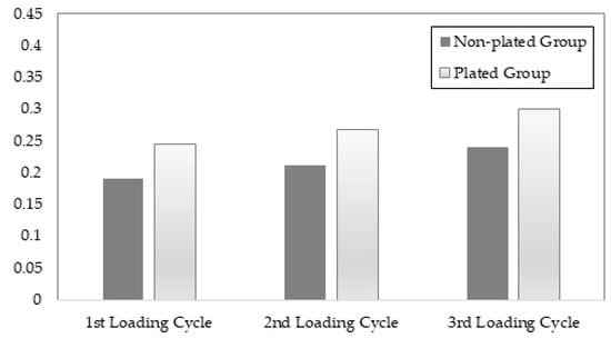 The mean CoF values between the non-plated and plated sample group gradually increase, while the mean interference values decrease after each loading cycle, which can be explained by the hardening of the surface asperities or strain aging on the hub surface. These effects also show a negative trend for CoF changes. The elastoplastic deformation of the asperities cancels out the stresses at the fit interface, which slowly reduces the load-enhancing effect of the nickel layer. The difference between the non-plated and plated group drops from 22.5% (between 0.19 and 0.244) at the first loading cycle to 20% (between 0.24 and 0.30) after the third time (as shown in Figure 8). This result is a warning for further studies into the sustainability of mechanical assembly parts.