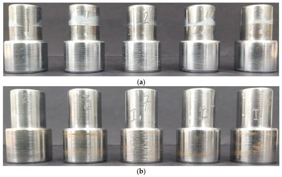 Regarding the clearance-fit group, electroplating was used to add a nickel layer on the shaft surfaces, with a thickness tp of about 150–200 μm, followed by grinding processes to reduce the shaft diameters until they reached the average diameter of the interference-fit group. There were clear distinctions in the shaft surfaces between the testing stages (Figure 2).