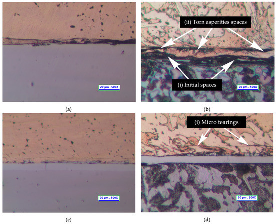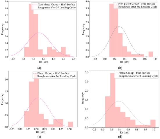 In the plated sample, the plated material filled most of the asperities on the shaft, resulting in better contact surfaces. This phenomenon can be explained by the increase in asperities flattening while reducing the material tearing on the inferior surface (Figure 12d), which increases the interface pressure and enhances the fit’s load capacity.