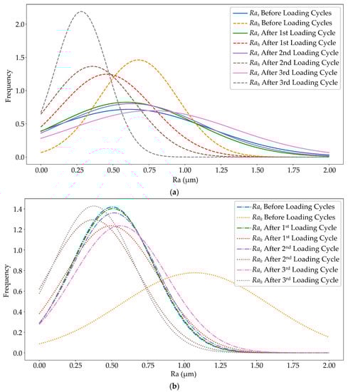 Probability density curves for the mean roughness value before and after the first loading cycle of the non-plated (a) and plated (b) group.