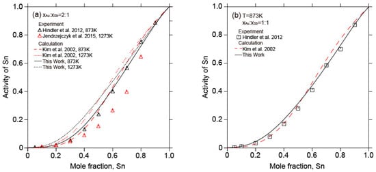 Figure 15 shows the calculated activity of Sn in liquid Au-Sb-Sn alloys along different sections ( = 2:1,  = 1:1,  = 1:2) at 873 K and 1273 K in relation to the experimental data [,]. A slight deviation from the experimental data [] at 1273 K was found. Nonetheless, good agreement was still achieved between the calculated activity of Sn in liquid Au-Sb-Sn alloys in this work and the experimental results [,].