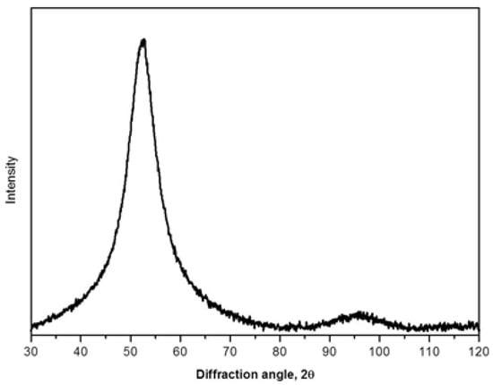 where Ic and Iam are the integral intensity of the reflections of the crystalline phase and the amorphous phase, respectively, and α is a constant. In the formula, the coefficient α is constant, and it may be different for different systems. The constant α was assumed to be 1.05 for alloys of the Finemet type []. As it was shown in [], the most correct values might be obtained through analyzing the angle range of the first diffuse halo, i.e., in the region of the best signal/noise ratio.