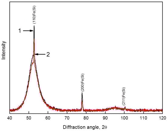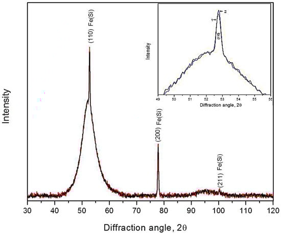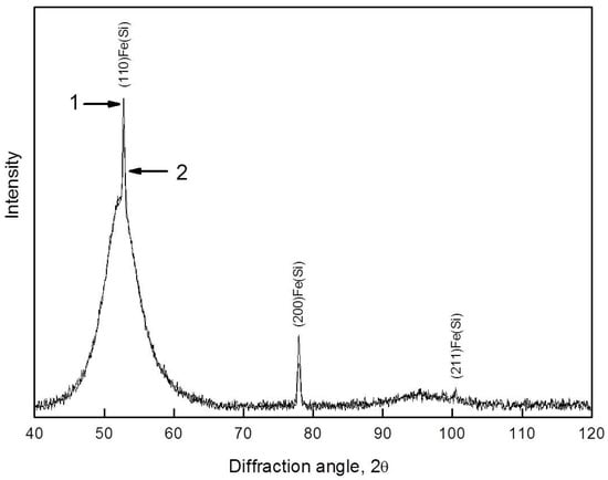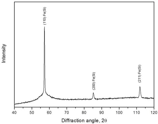 The structure of the samples was studied after both isothermal annealing in a resistance furnace and heating at a constant rate in a calorimeter. Crystals of Fe(Si) solid solution are formed at the first stage of crystallization, and a eutectic reaction with the (Fe(Si) + Fe3B) formation occurs at the second crystallization stage. After the first stage of crystallization, the structure consists of crystals of a Fe(Si) solid solution and a remaining amorphous phase. The lattice parameter of the solid solution is 2.844 Å, which agrees with data in the known literature []. Figure 3 shows the X-ray diffraction pattern of the alloy after the first stage of crystallization.
