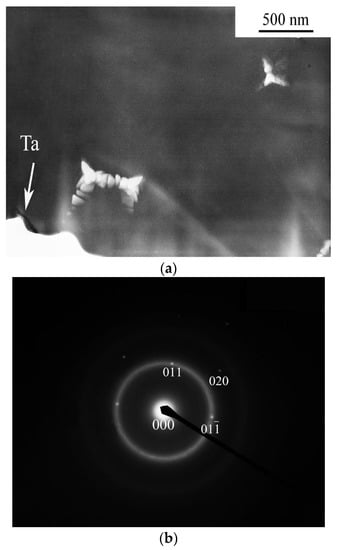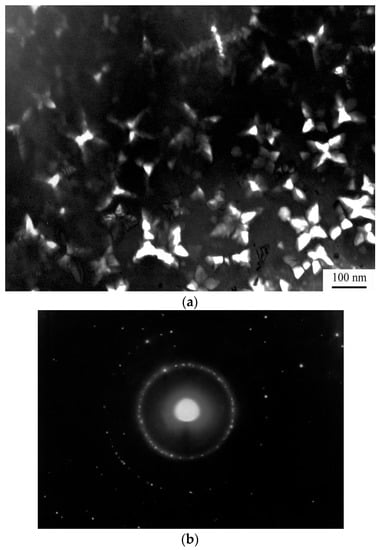 (a) TEM image of the alloy with a protective coating at the initial stage of crystallization. (b) The electron diffraction pattern of the structure shown in Figure 7a.