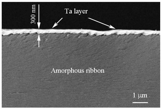 To assess the role of free volume in the process of crystallization of the amorphous phase, the samples were subjected to ultrasonic treatment for 1 h. After this treatment, the samples remained amorphous. Then, a protective coating (Ta layer) was applied to both surfaces of the ribbon. Figure 5 shows the microstructure of a sample with a protective coating. The layer thickness is indicated in the figure. After applying the protective coating, the as-prepared sample and the coated and uncoated samples processed in the ultrasonic bath were subjected to isothermal annealing simultaneously.