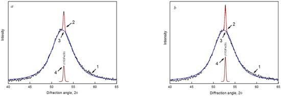 To estimate the fraction of the crystalline phase and the size of the formed crystals, the overlapping maxima of the XRD pattern were separated. Figure 8 shows the decomposition of the maxima for the annealed samples without a protective coating (8a) and with a protective coating (8b). In the figures, curve 1 corresponds to the experimental XRD pattern, curve 2 (red) is the summation curve, curve 3 (blue) is the scattering from the amorphous phase, and curve 4 is the reflection from the crystalline phase. In almost the entire angular range (with the exception of the region of the diffraction peak), curves 2 and 3 coincide. Peak 2 in both figures is a (110) reflection of Fe(Si) crystals. Its intensity in Figure 8b (samples with a protective coating) is noticeably greater than in Figure 8a (samples without a protective coating).