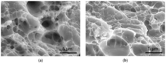Figure 10 shows the fracture surfaces of specimens cut along the 45° (Figure 10a,c,e) and 90° (Figure 10b,d,f) directions relative to the rolling direction. The micrographs were taken at a high magnification (5000×) to comprehensively identify the fine dimple morphology typical of a ductile fracture process resulting from the nucleation, propagation, and coalescence of voids. A combination of very shallow and deeper dimples is a typical type of fracture for aluminium alloys and other metals tested at ambient temperature [30]. The aluminium alloy 2024-T3 was subjected to natural aging, which resulted in the precipitation of homogeneously distributed submicron particles, causing strengthening and acting as initiation points for the creation of very fine dimples on the fracture surfaces (Figure 10c). No clear relationship between fracture morphology and strain rate was observed. Indeed, no noticeable changes were observed in the size or shape of the dimples when the strain rate was increased.