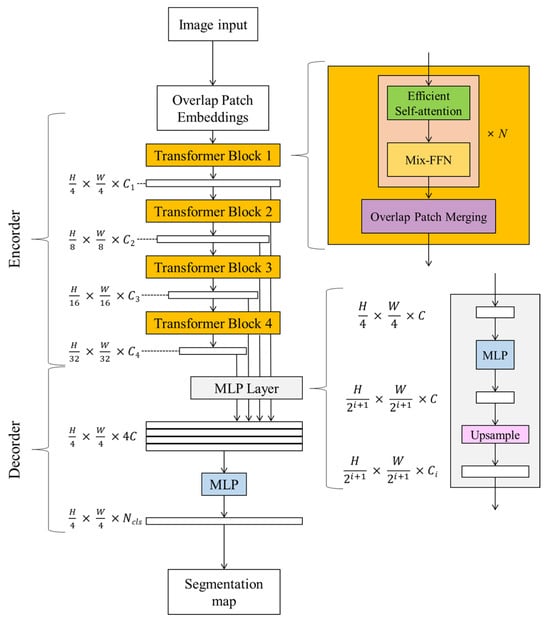 - Xie, E.; Wang, W.; Yu, Z.; Anandkumar, A.; Alvarez, J.M.; Luo, P. SegFormer: Simple and Efficient Design for Semantic Segmentation with Transformers. In Proceedings of the Advances in Neural Information Processing Systems, Online, 6–14 December 2021; Curran Associates, Inc.: New York, NY, USA, 2021; Volume 34, pp. 12077–12090. [Google Scholar]