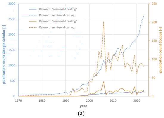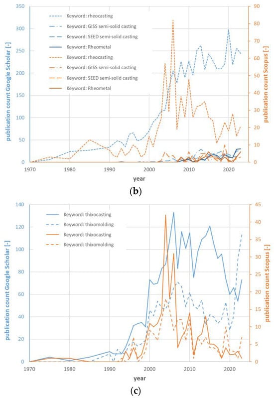 Publication numbers sourced from Google Scholar and Scopus on semi-solid casting technologies: (a) semi-solid casting in general, (b) rheocasting and (c) thixocasting process family examples. Note that keywords had to be adapted slightly for scanning different databases.