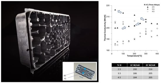 Special cases among such wrought alloys are those that are not primarily selected for structural properties but rather for functional properties like thermal or electrical conductivity. Here, a link to e-mobility applications, as discussed in Part I of this work, is apparent, e.g., in rotor casting []. Classical rotor aluminum Al99.7 is almost pure and characterized by limited castability; nevertheless, it is employed in HPDC to produce electrical engine components []. Alternatives include low alloyed materials such as AlMn1.6, as, e.g., offered by Rheinfelden, which do pose similar castability problems but add strength, increasing yield strength from Al99.7’s 20–40 MPa to 90–120 MPa []. Increasing interest in such materials is also exemplified by recent patent applications, e.g., from Tesla [,]. The aspect of strength is introduced here due to the fact that there is a tendency in the automotive industry to increase electrical traction motor speed to allow for more compact designs, a trend which will raise the centrifugal forces acting on the rotors [,]. Beyond this, requirements regarding conductivity resemble those for radio filters and other electronic components as described above (see Figure 3). The link to rheocasting is established by its proven capability to handle materials with inferior castability. Candidate, low alloyed material systems like some of those summarized in Table 1 could profit from this.