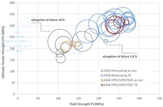 Overview of rheocast and high-pressure die-cast aluminum and magnesium alloys in as-cast and T6 states in terms of yield strength, ultimate tensile strength and elongation at failure. The latter is represented by the size of the spheres. Data are sourced from [,,,,,,,,,,,,].
