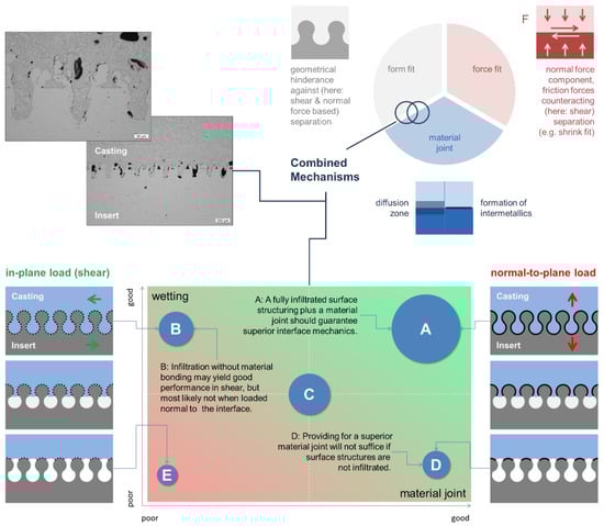An overview of principles controlling strength in compound casting. The image in the top left corner shows metallographic sections of infiltrated surface structures created via laser pulses to facilitate a micro-scale form fit. E in the image marks the worst case, poor wetting and bonding, while C denotes the middle position. More interesting are the extreme cases described in the image.