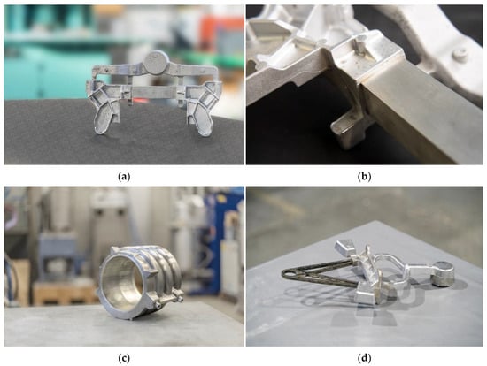 Sample images of parts produced by compound (a–c) and hybrid casting (d); (a,b) AlSi7Mg0.3 LPDC subsize front axle carrier frame demonstrator with integrated EN AW-6060 extrusion, general (a) and detail view (b); (c) AlSi9Cu3 HPDC e-motor housing demonstrator with integrated aluminum tubes as cooling channels, cast by ae group AG, Gerstungen, Germany; (d) aerospace secondary structure hybrid bracket combining a CFRP and an aluminum HPDC component [] (all images by Fraunhofer IFAM).