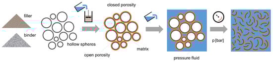 The fundamental principle behind the concept of collapsible cores. Hollow microspheres are embedded in an open-porous matrix. Decoring is achieved via cold isostatic pressing. Fluid entering the open porosity of the matrix in which the microspheres are embedded exerts pressure on the latter, making them collapse. The integrity of the core is lost, and its remainders can easily be washed out [,].