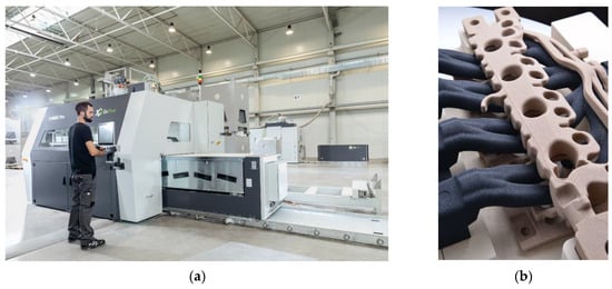 Much better established on an industrial scale is the printing of lost patterns, cores and molds. A recent review encompassing the full range of the topic was published by Shah et al. []. Specifically, the printing of sand cores and molds-often referred to as 3D sand printing (3DSP) - has already developed into a standard process. While there are solutions based on selective laser sintering (SLS) using binder-coated sand [,], binder jetting clearly dominates the field []. The massive advantage of this technique is that it combines the fundamental characteristics of the well-recognized sand-casting process with the productivity of a fast AM process. In essence, for sand casting, this unleashes all the geometrical freedom of the AM process but, for the final parts, saves the often-horrendous material costs associated with direct metal printing processes. As an added benefit, the possible part sizes surpass the typical limitations of common metal AM systems by far []. This new flexibility can be used to optimize the part itself but also to adapt the casting system, e.g., in terms of flow conditions yielding low-defect and, thus, high-performance parts. The latter approach was demonstrated by Sama et al. [,], who went even further by using AM processes for the integration of sensors in sand molds in order to facilitate the direct monitoring of melt flow, mold filling, core shift or ventilation during production [,,]. Recent reviews on sand printing technology and use were provided by Upadhyay et al. and Sivarupan et al., who both stress the advantages of the process and highlight the evolution of the field [,], while Thiel et al. dedicated their slightly earlier study to the materials employed in this process []. An important aspect, which clearly illustrates the difference between sand printing and direct metal additive manufacturing processes, is the performance data documented in their studies: In sand printing, build rates reach more than 100 L per hour instead of cubic centimeters as in the case of powder-based metal AM, while the dimensions of the largest systems’ build envelopes are measured in meters [,]. Major equipment providers like ExOne or Voxeljet offer systems with maximum build volumes of up 1.9 and 8 cubic meters, respectively. Figure 8 provides an idea of the sizes of such system, as well as an example of a complex core package printed using two types of binders.