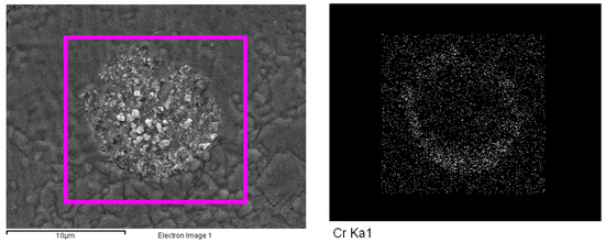 Through in situ observations using HTCLSM, it was evident that black precipitates formed during the holding process at 900 °C. These precipitates persisted even when the temperature was increased to above 1000 °C, indicating their thermal stability. The appearance of these precipitates during the heating process likely influenced the mechanical properties of the material. To further investigate the nature and characteristics of these precipitates, a sample subjected to the same heating rate and soaked at 900 °C for 5 min was rapidly cooled to room temperature to preserve the dark precipitated phase particles. Scanning electron microscopy (SEM) and energy-dispersive spectroscopy (EDS) analyses were then conducted on the precipitates, as shown in Figure 6 and Figure 7.