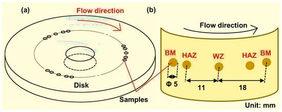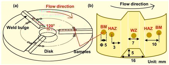 (a) The rotating disk with weld reinforcement height for simulating the convex weld, and (b) the samples’ positions on the disk.