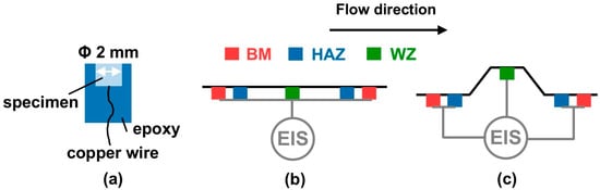 The samples taken from the welded joint were cylinders with a diameter of 2 mm. The back of the samples was welded with copper wire and sealed with epoxy resin. To ensure the repeatability of the experiment, microstructure observations of the samples were conducted before the experiment to be consistent with the WZ, BM, and HAZ. The mold and all sample dimensions were also measured and verified. Before the experiment, the exposed surfaces of the samples were polished with # 800 sandpaper.