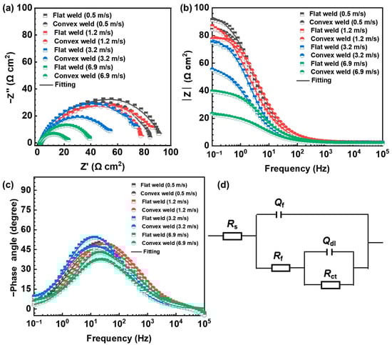 (a) Nyquist plots and (b,c) Bode plots of flat and convex welds after the 6 h corrosion test. (d) Equivalent circuits used for EIS fitting curves.