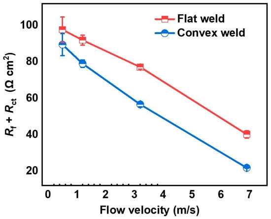 The capacitive semicircle and Rf + Rct value of the convex weld are smaller than those of the flat weld at the same flow velocity (Table 2). It indicates that the local disturbance introduced by the weld reinforcement height enhances the corrosion of the welded joint.