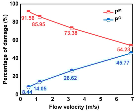 The percentage of damage caused by the material inhomogeneity in the flat weld and the geometry of the convex weld at different flow velocities.