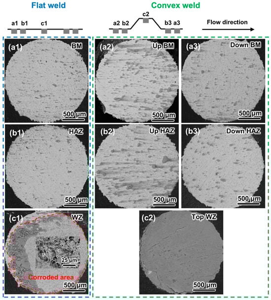 SEM images of the flat and convex welds after the 6 h corrosion test at 6.9 m/s: (a1–a3) BM, (b1–b3) HAZ, and (c1,c2) WZ.