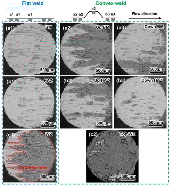 Two-dimensional projection images of the flat and convex welds after the 6 h corrosion test at 0.5 m/s: (a1–a3) BM, (b1–b3) HAZ, and (c1,c2) WZ.