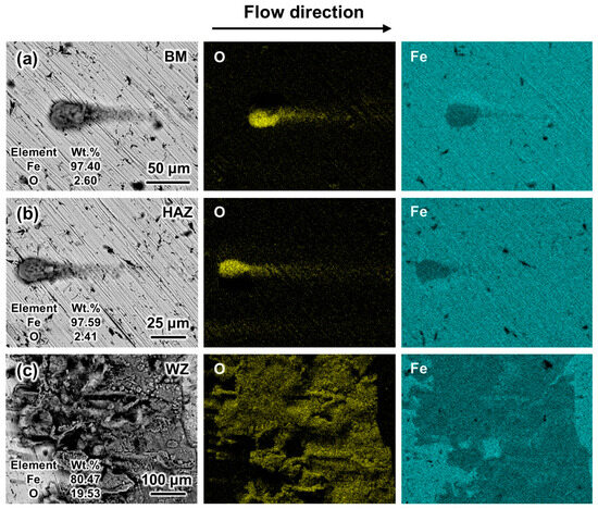 The magnified morphology and the composition of the corrosion products on the flat and convex welds under experimental flow velocities were analyzed. It was found that all the materials of the welded joints had similar oxide components. Therefore, samples from the BM, HAZ, and WZ of the flat weld at 0.5 m/s were selected as the representative morphologies, as shown in Figure 10. The head of the corrosion products on the BM and HAZ surfaces is circular, and the corrosion products distribute along the flow direction (Figure 10a,b). The coverage area of corrosion products on the WZ surface is the largest (Figure 10c). The EDS results indicate that the corrosion products are mainly iron oxides, which are similar to those in other positions. It can be inferred that the types of elements are not changed by the flow state.