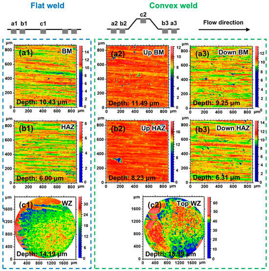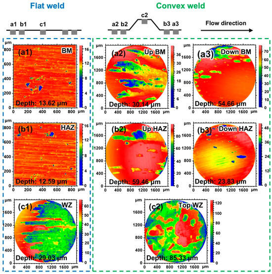 Figure 9 displays the corrosion morphology of the flat and convex welds after the 6 h corrosion test at 6.9 m/s. The corrosion products on the surface of each sample are still distributed along the flow direction (Figure 8). Compared with the BM and HAZ (Figure 9(a1–a3,b1–b3)), there are more corrosion products on the WZ for both the flat and convex welds (Figure 9(c1,c2)). The area covered by corrosion products on each sample of the convex weld is larger than that on the flat weld (Figure 8(a1–c2)), indicating more severe corrosion of the convex weld.