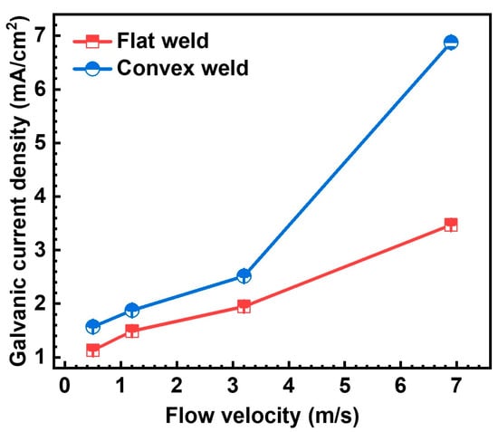 Figure 13 presents the stabilized galvanic current density of both the flat and convex welds at 0.5 m/s, 1.2 m/s, 3.2 m/s, and 6.9 m/s. The galvanic current densities are positive values for both the flat and convex welds at all flow velocities. Based on the results of galvanic corrosion and the morphology of severe corrosion in the WZ (Figure 8, Figure 9, Figure 10, Figure 11 and Figure 12), it can be determined that the WZ is the anode, while the connected BM and HAZ are the cathode. They are not altered by the geometric discontinuity and flow velocity. This implies that the most severe corrosion of the WZ is not affected by the flow state. Galvanic current densities reached the mA/cm2 level, which was significantly higher than those considered indicative of galvanic corrosion (less than 10 μA/cm2), according to the literature []. Therefore, it is confirmed that galvanic corrosion occurs.