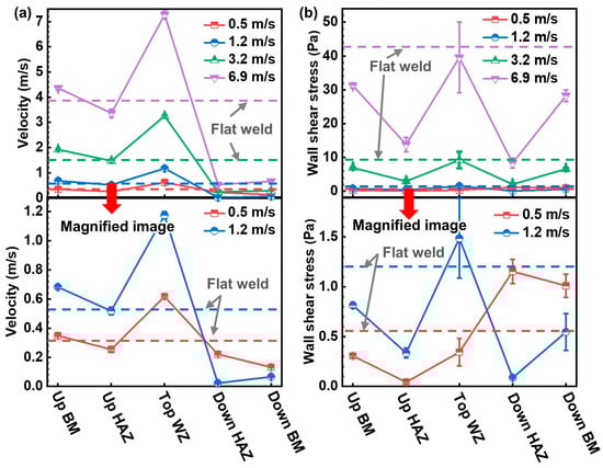 (a) The flow velocity at 2 mm from the wall and (b) wall shear stress on the wall of the samples at different positions of the welded joint. “Up” represents upstream, and “Down” represents downstream.