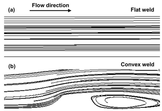 The wall shear stress for the flat weld is the same at each position, but it fluctuates around the convex weld (Figure 14b). Both the flat and convex welds experience relatively lower wall shear stress at low flow velocities (0.5 m/s and 1.2 m/s) than at higher flow velocities (3.2 m/s and 6.9 m/s). Compared with the flat weld at 3.2 m/s and 6.9 m/s, there is lower wall shear stress on the upstream and downstream regions of the convex weld. However, the wall shear stress of the top region is similar to that of the flat weld. It is generally considered that a higher flow velocity is related to a higher corrosion rate []. A high wall shear stress can destroy corrosion products []. The influence of fluids on corrosion behavior still needs to be further analyzed in combination with stream traces.