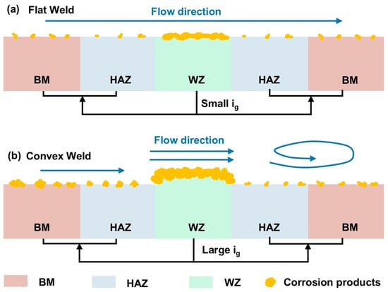 Figure 16 displays the corrosion mechanisms of welded joints. The flow state at different regions of the flat weld is similar under the same flow velocity. Therefore, the difference in corrosion behavior is mainly caused by the material properties. Both the BM and HAZ contain 0.36 wt.% Cr, while the WZ contains no Cr (Table 1). The literature suggests that Cr could enhance the corrosion resistance of materials []. The composition factors contributed to a higher corrosion sensitivity of the WZ. Moreover, pearlite structures are composed of both ferrite and cementite. Studies indicated that ferrite dissolves more preferentially than cementite [,]. The ferrite content in the BM was 24.23% higher than that in the HAZ (Figure 4). Therefore, the BM suffered more severe corrosion than the HAZ. Additionally, the galvanic effects between the samples exacerbated the corrosion of the WZ (Figure 13). Therefore, material properties and galvanic effects lead to different corrosion sensitivity of the flat weld, which can be ranked in positive order of WZ > BM > HAZ (Figure 11 and Figure 13).