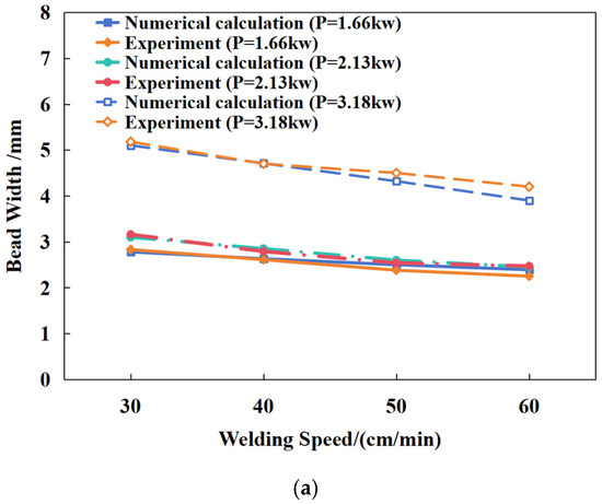 Once the parameters of the welding combined heat source model under fixed welding power were determined, different heat delivery conditions were used to test the effectiveness of the heat source model. Heat delivery during the welding process was proportional to the input power, and inversely proportional to the welding speed. Hence, a single variable method was used, which considered the input power and welding speed as variables, to explore the influence of these variables on the fusion line formation. First, the input power was 2.13 kW. Then, we used different welding speeds to compare the bead width and penetration obtained from numerical calculation and actual experiment results. Table 5 shows the comparative results of four groups of data.